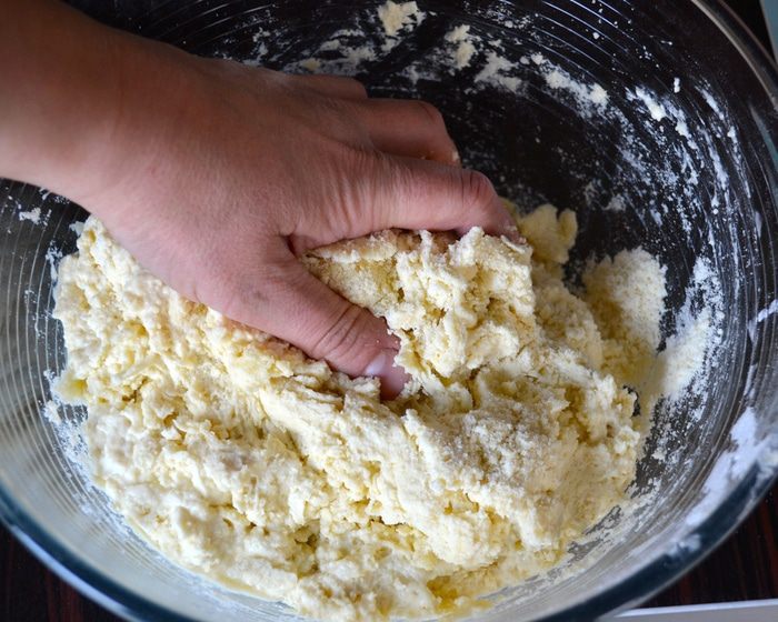 Влить яичную смесь в миску с мучной крошкой и замесить тесто. Оно должно получиться не очень крутое, но и не липнуть к рукам.