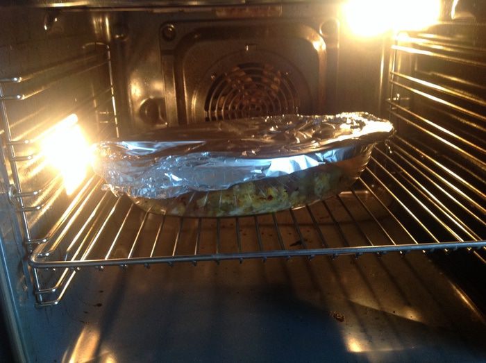 Накройте форму фольгой и запекайте в духовке 15 минут, затем снимите фольгу, перемешайте и запекайте еще 15 минут.