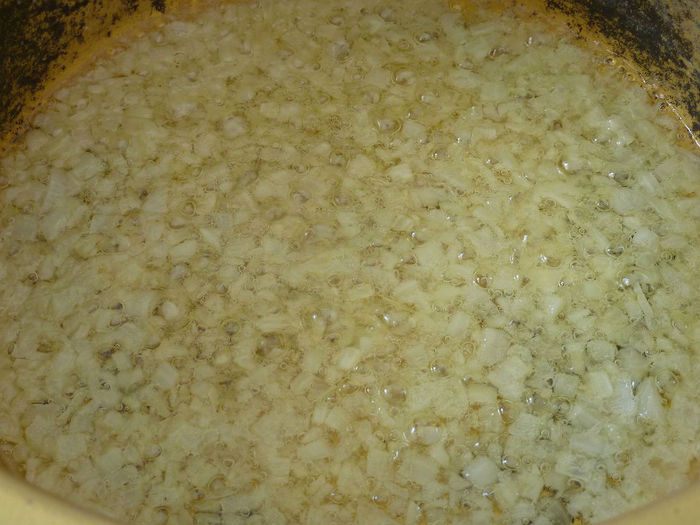 В кастрюле разогреть оливковое масло и сливочное. Лук порезать мелко и обжарить минут 5 на среднем огне.