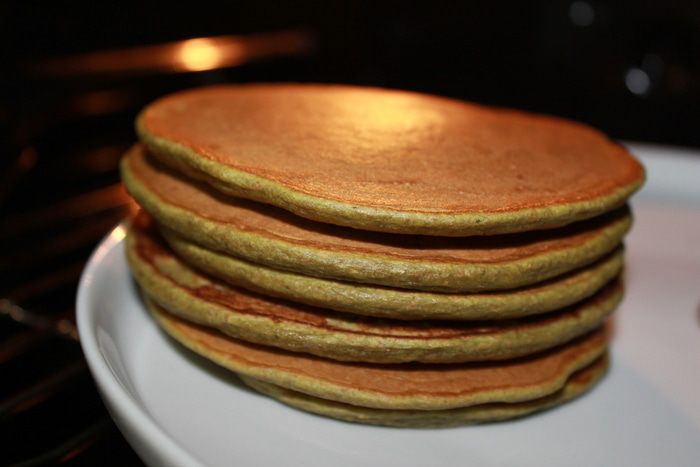 Получается 9 панкейков большего размера. Я их ставлю в духовку, пока все не спеку.