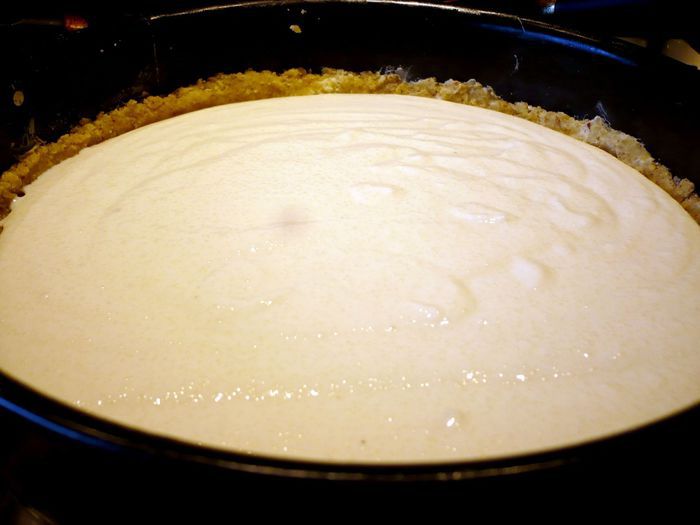 Духовку разогреваем до 180 градусов. Признаюсь, что каша у меня была подготовлена заранее, я использовала 370 г готовой каши из холодильника. Если вы будете готовить кашу отдельно для тарта, с нее необходимо начинать, доведем до кипения молоко с щепоткой соли и сахаром, всыпем, постоянно помешивая венчиком, крупу, варим до загустения каши, постоянно помешивая. Затем нужно дать каше немного остыть. Потом соединим ее с творогом, добавим пудру, сок лимона и ванильную эссенцию.