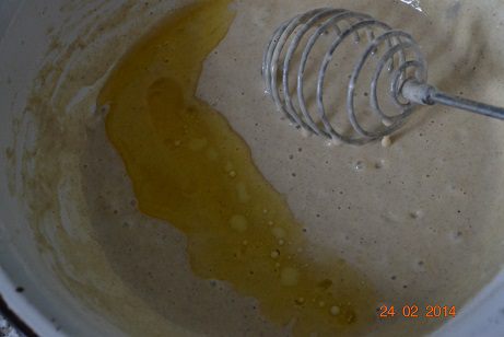 Всыпать муку и разрыхлитель, размешать до однородности, влить масло