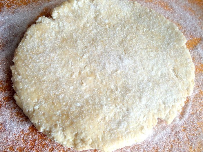 Если тесто нагрелось от рук,то лучше подержать его немного в холодильнике,но можно и сразу приступить к работе)) Для этого на большую доску насыпать слой сахара вместо муки.