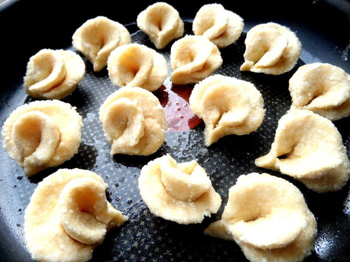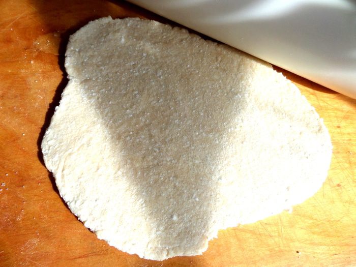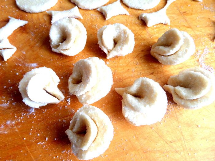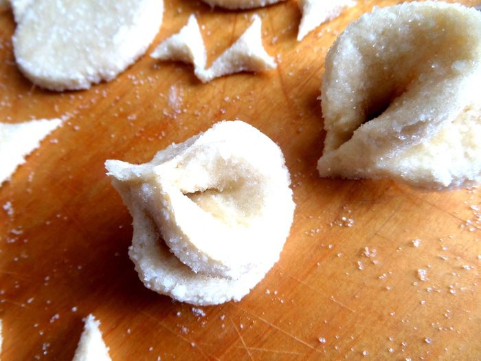 А потом снова пополам и защипываем уголки плотно,макая пальцы в муку.