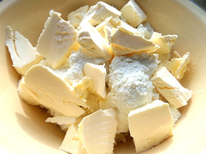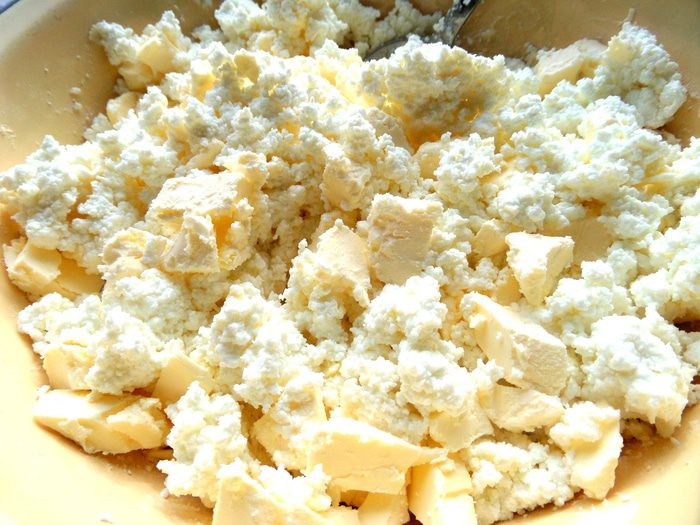 Творог протереть или взять однородный,добавить кусочки масла или маргарина.