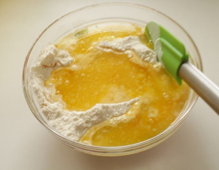 Добавить растительное масло, апельсиновый сок, перемешать.