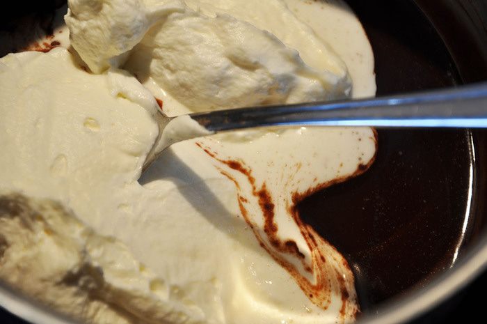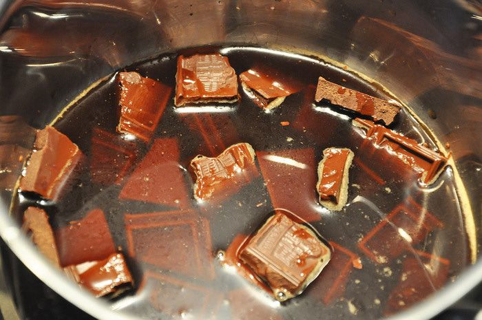 Шоколад растопить в кофе на медленном огне, постоянно помешивая.