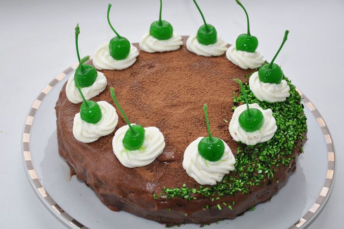 В центр просеять какао. Часть посыпать кокосом. Выдавить шприцом розочки. В каждую воткнуть вишенки. Поставить в холод-к на 1 час.