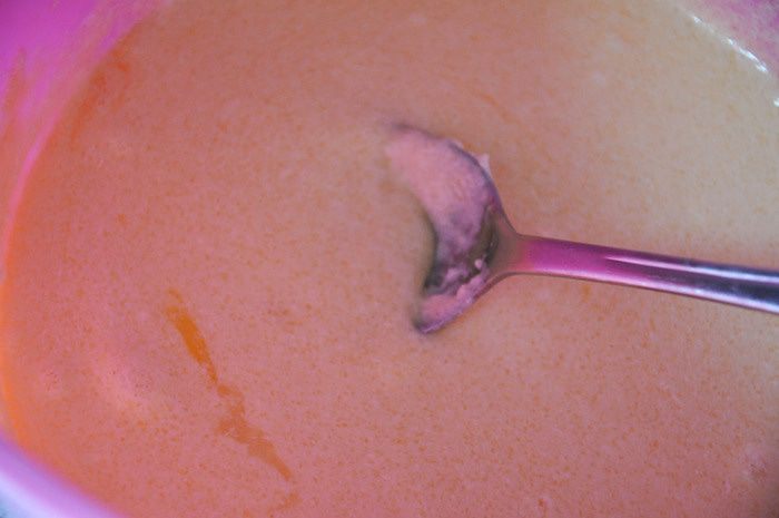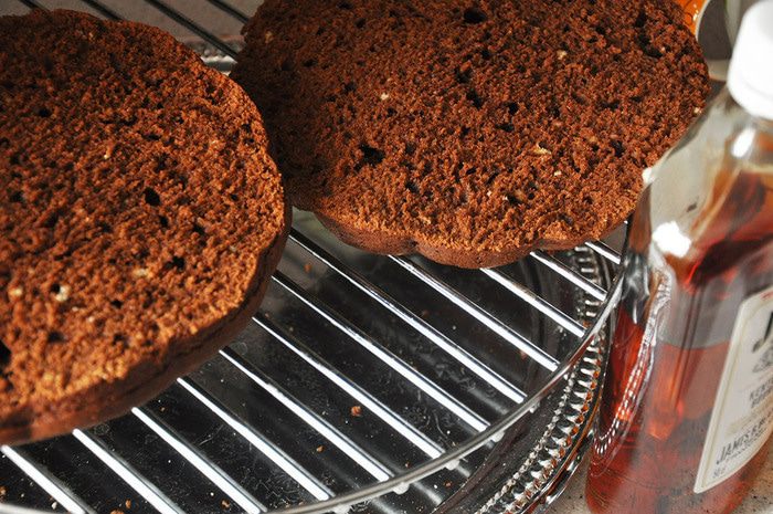 Вытащить корж, немного остудить, разрезать пополам и сбрызнуть обе половинки коньяком. Остудить.