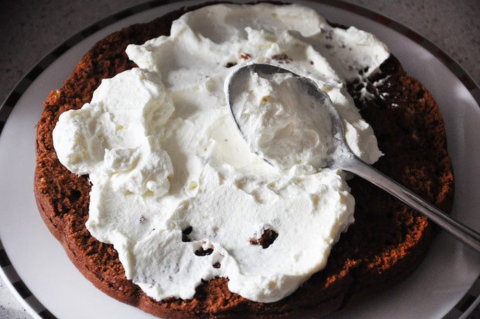 Приготовить крем. Взбить сливки до густоты, добавить пудру. Немного отложить в кондитерский шприц для украшения. Остальное выложить на нижний корж. Сверху накрыть вторым коржом.
