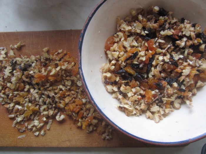 Грецкие орехи, чернослив ( можно взять кураги 75 г. и чернослива 75г.- по желанию) мелко нарезать.