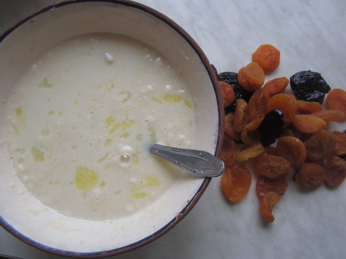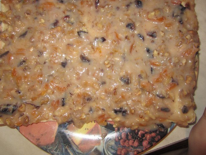 Смесь масла с сахаром смешать с остывшим кремом, взбить миксером, добавить сухофрукты и орехи.