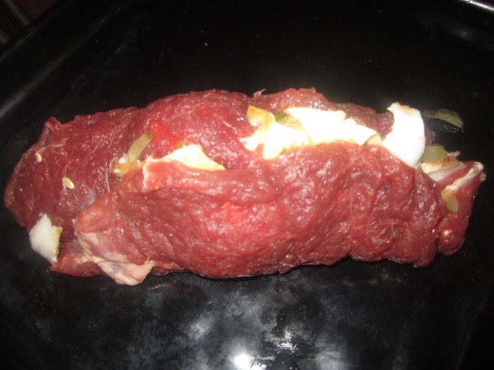 Приготовить соус. Муку поджарить на сливочном масле в течение 1-2 минут. Выделившийся при жарке сок мяса примешать к муке, 3 минуты томить его на медленном огне, постоянно помешивая ( при необходимости процедить, посолить). Перед подачей удалить нить, разрезать рулет, и обильно полить его соусом.