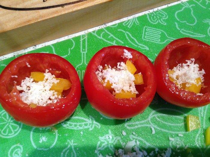 В томаты положить перец, тертый сыр.