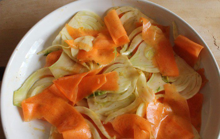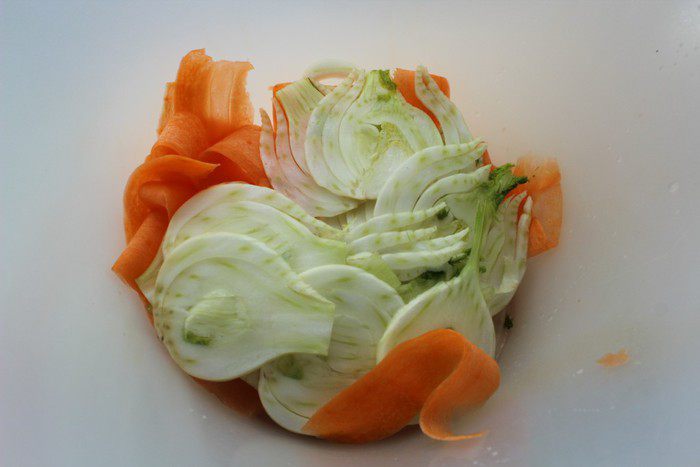 Клубень фенхеля также тонко нашинковать вдоль. Полить овощи соком лимона (из второй половины) и оливковым маслом, приправить солью и перцем.