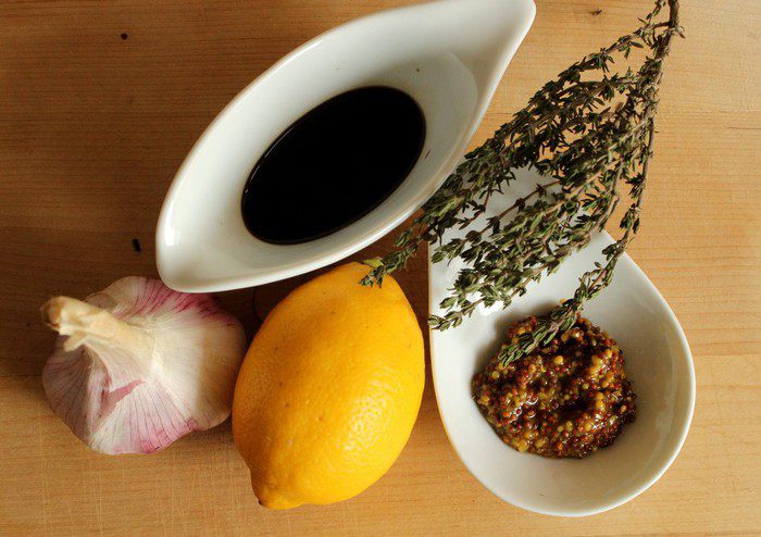 Смешать чеснок, соевый соус, горчицу и сок половины лимона. Тонкой струйкой влить масло (3 ложки из общего количества) и хорошо перемешать до однородности. Добавить листики тимьяна.