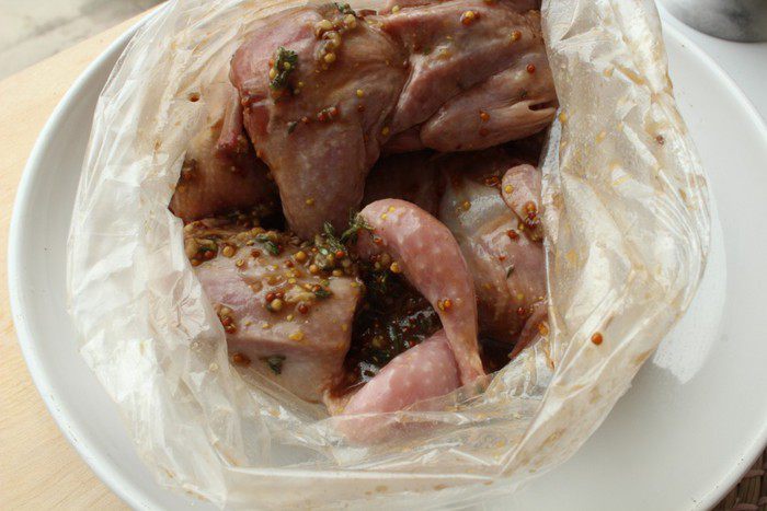 Сложить в полиэтиленовый пакет, залить маринадом, перемешать. Пакет завязать и отправить в холодильник на 2-3 часа.
