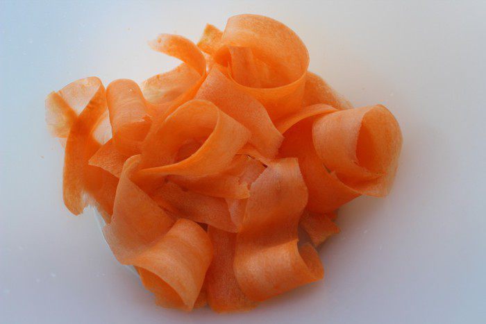 Морковь нашинковать слайсами. Это легко сделать при помощи ножа для чистки картофеля и моркови.