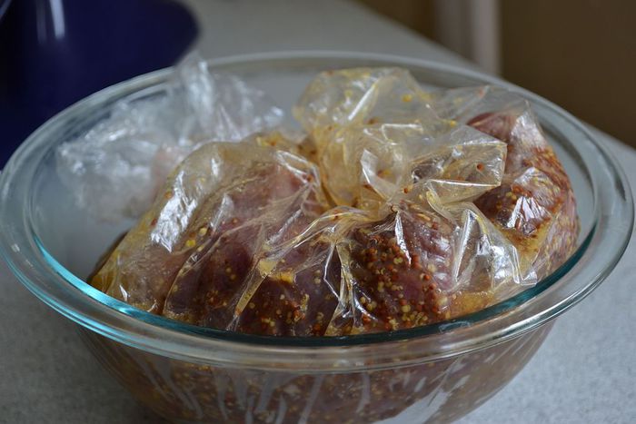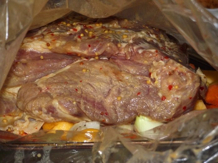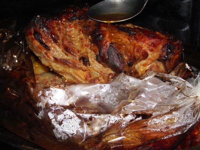 Мясо запекаем первые 15 минут при 200 градусах, затем уменьшаем до 160 градусов и еще минут 35. Аромат меда и лимона благоухает по всей кухне. Самое время открыть пакет и полить мясо соком.