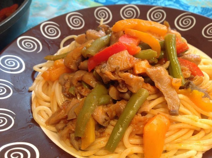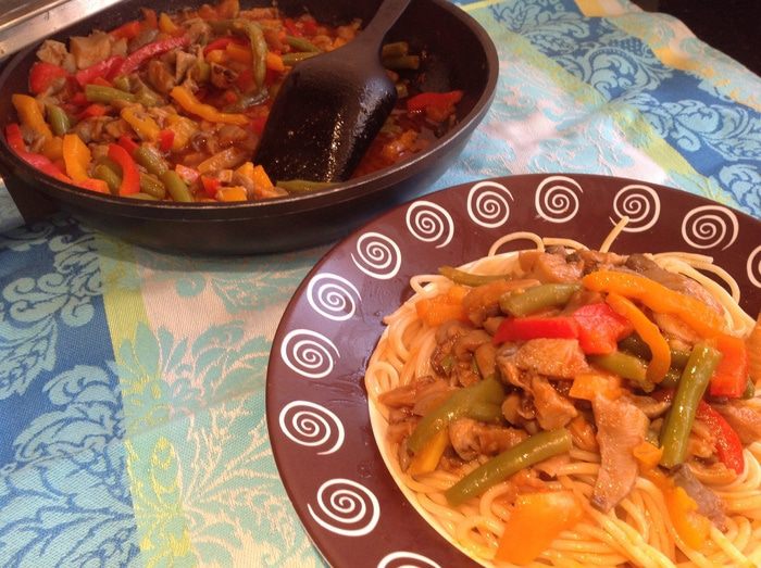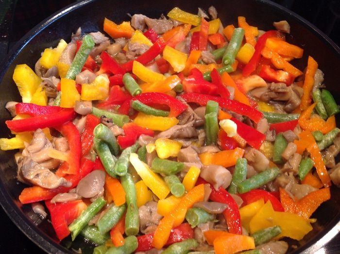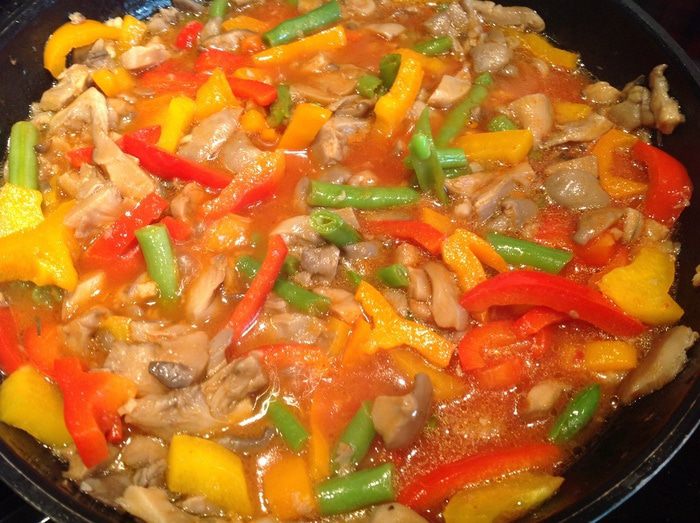 На этом этапе, если бы у меня были свежие сочные помидоры, я бы сняла с 4 шт. кожицу, порезала и добавила бы к грибам... но, к сожалению... поэтому я взяла 2 ст. л. томатной пасты, разбавила 1 ст кипятка и добавила к грибам. Приправьте перцем и посолите. Продолжайте тушить 10 минут.
