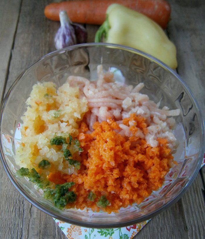 Куриное филе, морковь, перец (очищенный от семян), лук, чеснок и зелень кинзы пропустить через мясорубку.