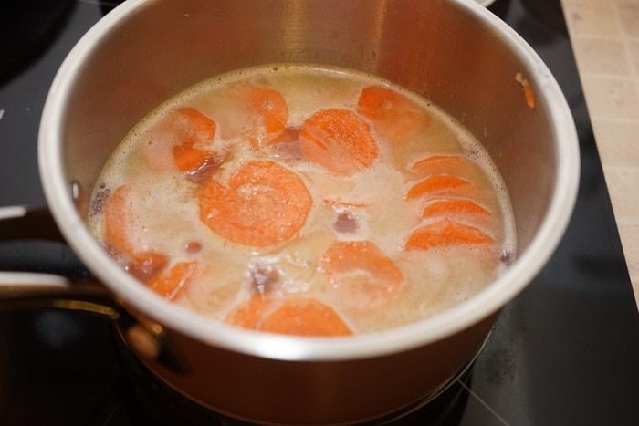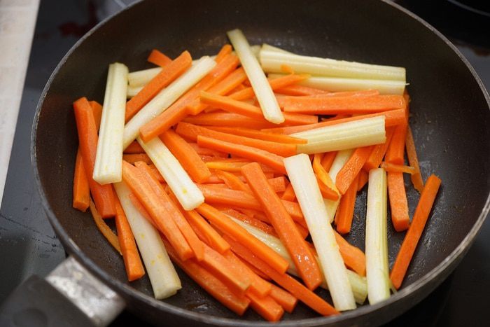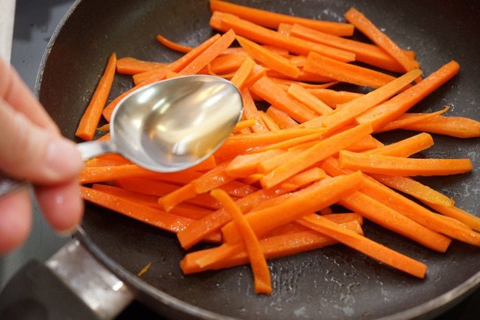 На разогретую с 1 ст.л растительного масла сковороду выкладываем морковь, немного обжариваем со всех сторон, добавляем 1 ст. ложку яблочного уксуса, выпариваем его.