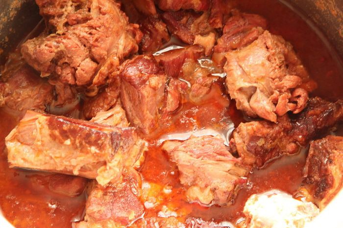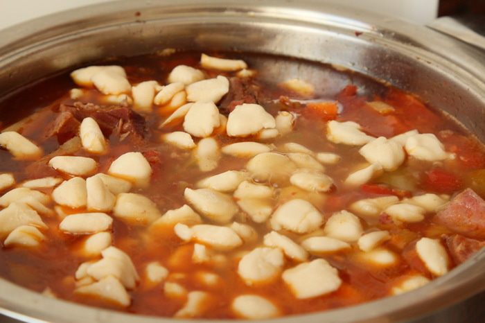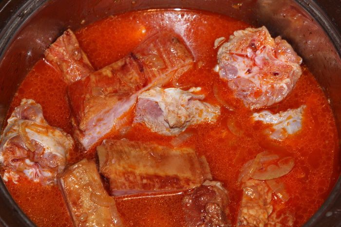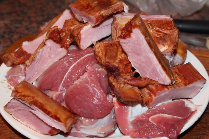 Для приготовления бограча нужно несколько сортов мяса, желательно - говядина, телятина, рулька, ребра. Кроме этого, обязательно копченое сало с прослойкой, домашние копченые колбаски, которые у нас называются "пикница", специи на ваш вкус, из обязательных - паприка, тимьян, чеснок и острый перец. Мука дана в раскладке приблизительно, все зависит от размера яйца. У меня в рецепте - копченые свиные ребрышки.