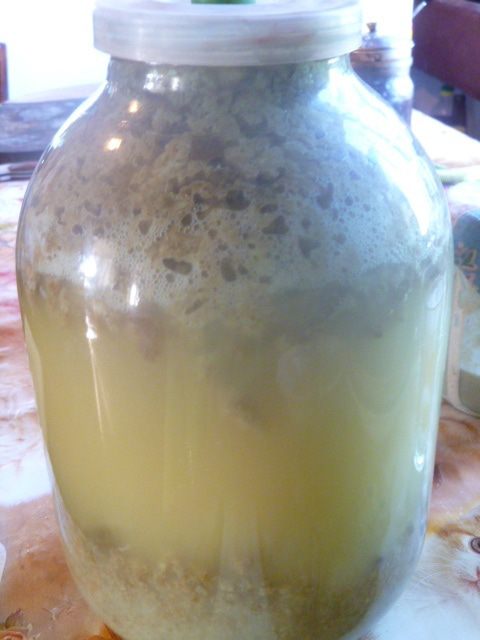 В остывший настой добавляем 100 г ржаной закваски на пике активности (подкормить, в тепло и до увеличения вдвое). Закваску предварительно размешать в небольшом количестве настоя, затем вылить в бутыль.