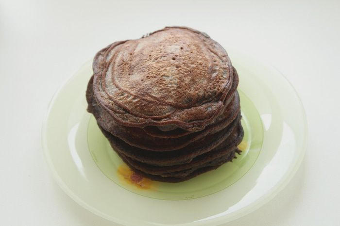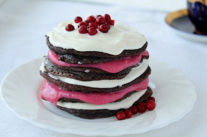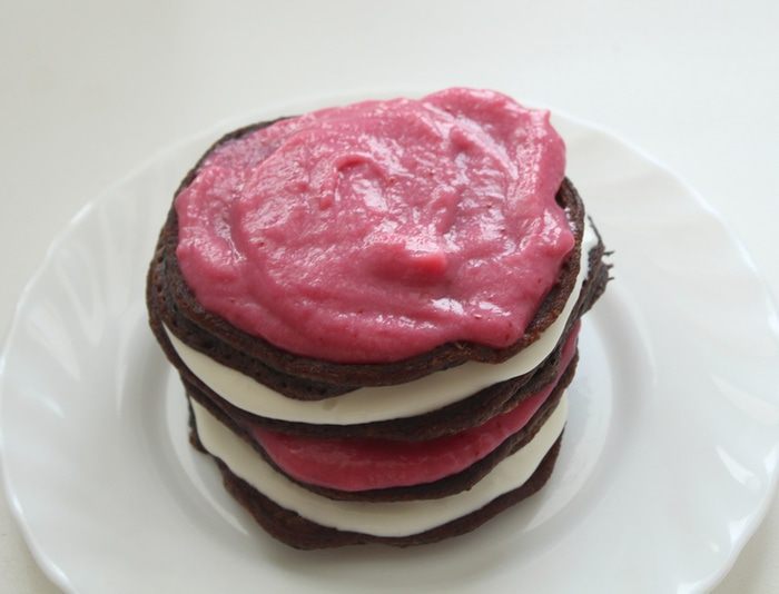 Смазать оладьи сливочным кремом и брусничным курдом по очереди.
