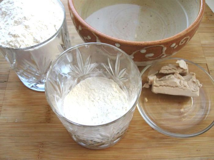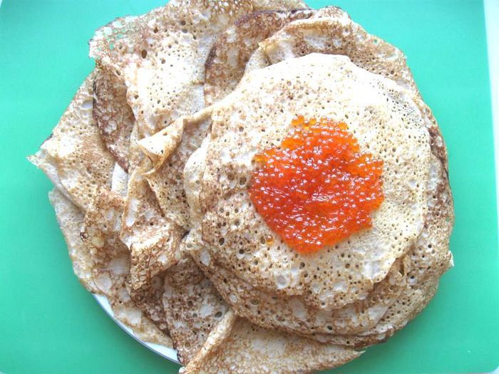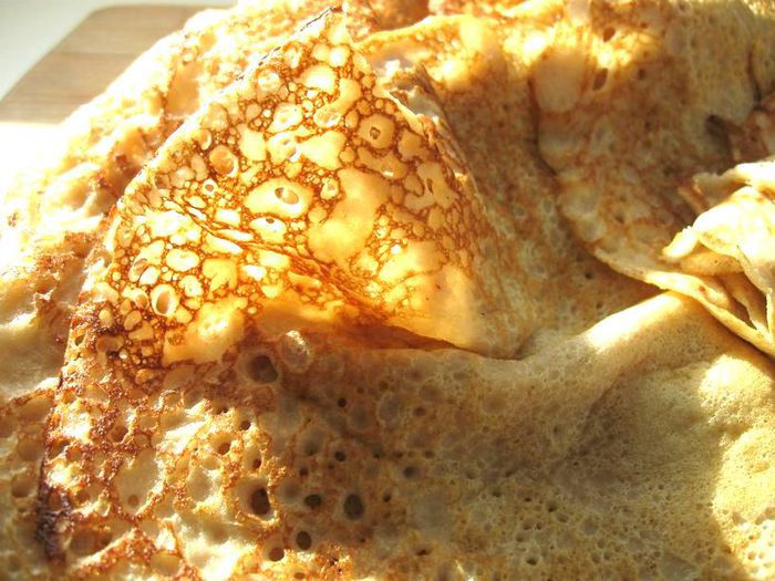 Всыпать в опару гречневую муку и добавить 300 мл горячего молока, размешать быстро, потом добавить постепенно еще 300 мл теплого молока, перемешать. Посолить, добавить сахар, сливочное масло, растертое с желтками. Перемешать и оставить в теплом месте минут на 30 – 40.