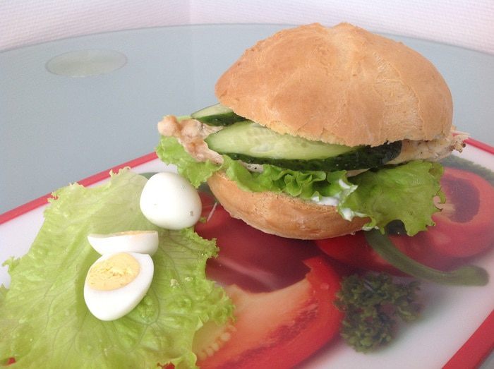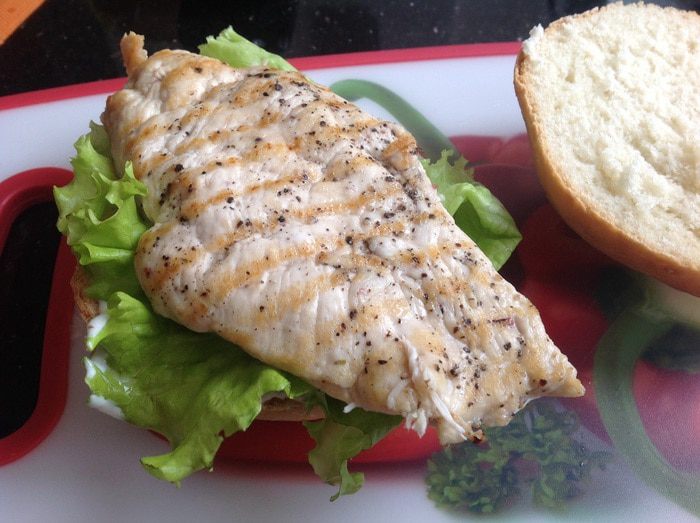 Сверху выложите листья салата, куриную грудку, огурец и накройте второй половиной булки.