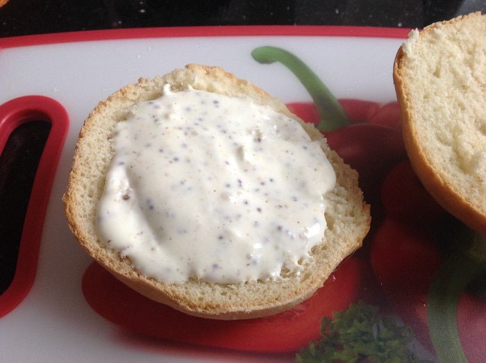 Булочку для гамбургера разрежьте вдоль, нижнюю часть булки обильно смажьте соусом.