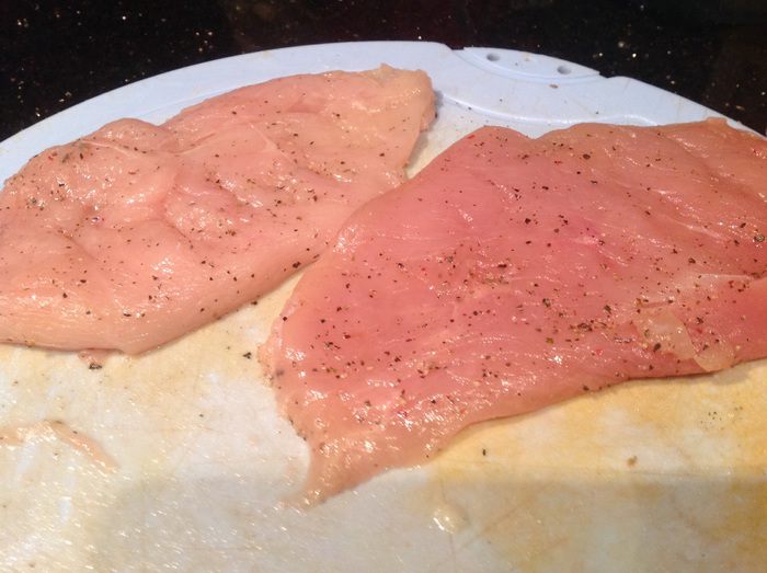 Куриную грудку разрежьте вдоль на две части, слегка отбейте, посолите и поперчите, смажьте растительным маслом с двух сторон.