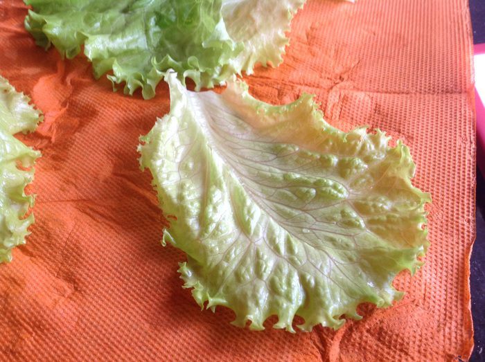 Листья салата промойте и обсушите бумажным полотенцем.