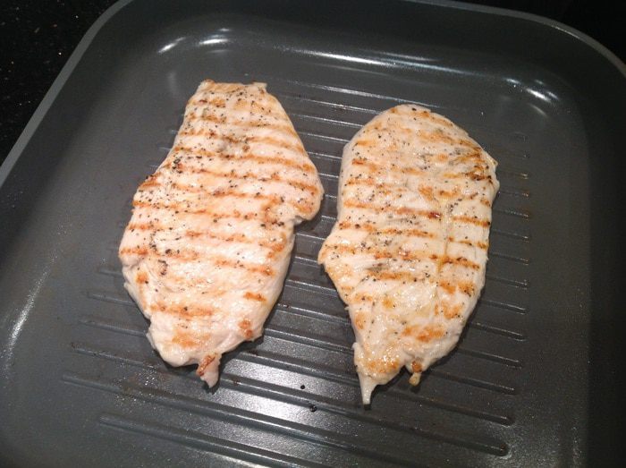Обжарьте куриные грудки на сковороде гриль по 2-4 минуты на каждой стороне.