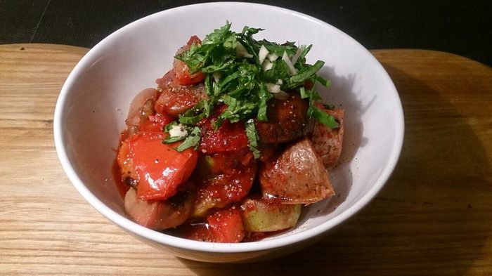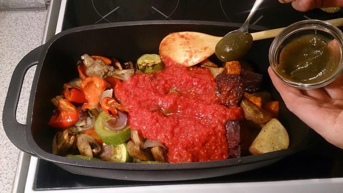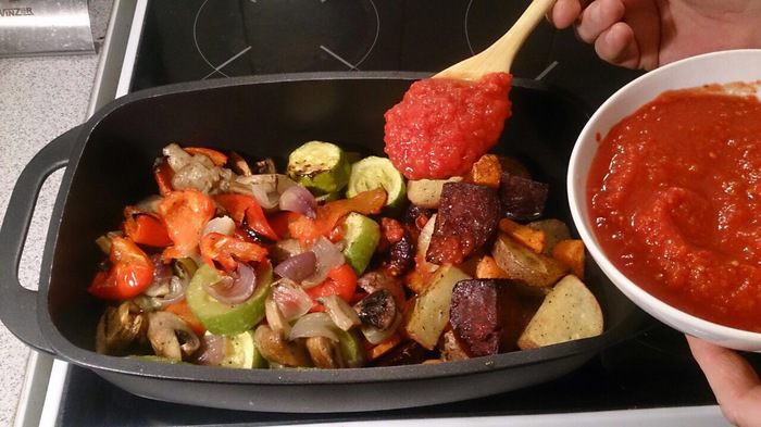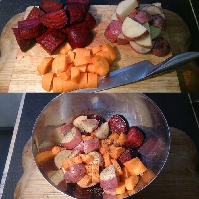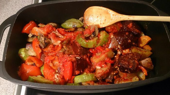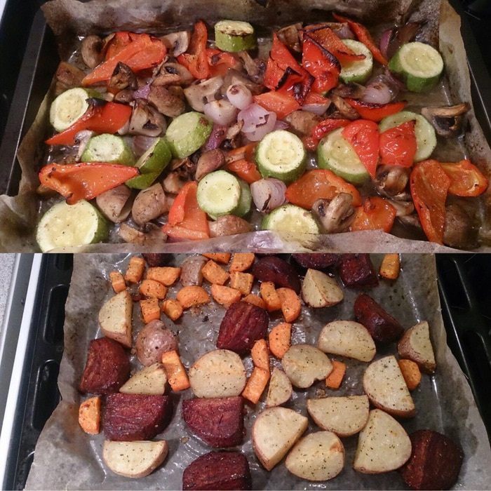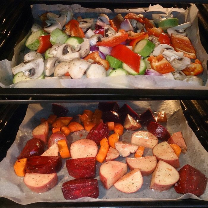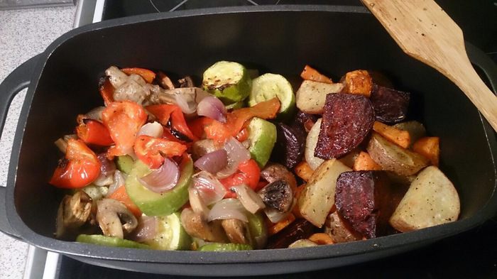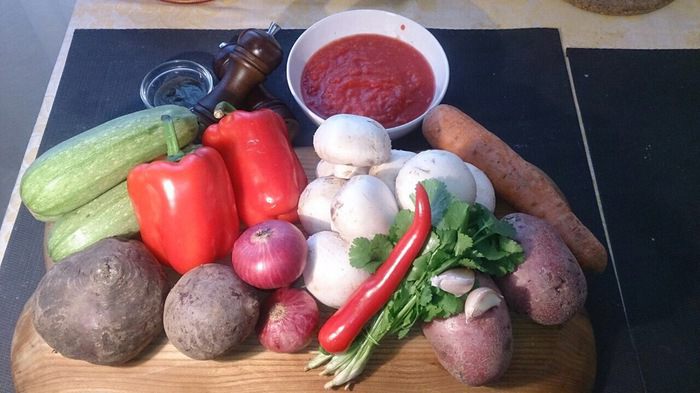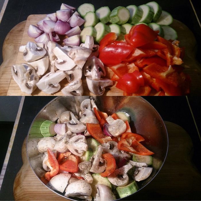 Нарезаем толстенькими шайбами кабачки, перец — крупными дольками, грибы — на 4 части, лук — на 4 части, сбрызгиваем оливковым маслом, присыпаем крупной морской солью, молотым перцем и прованскими травами. Если на фото не очень хорошо видно, то можно нажать кнопочку «на весь экран».