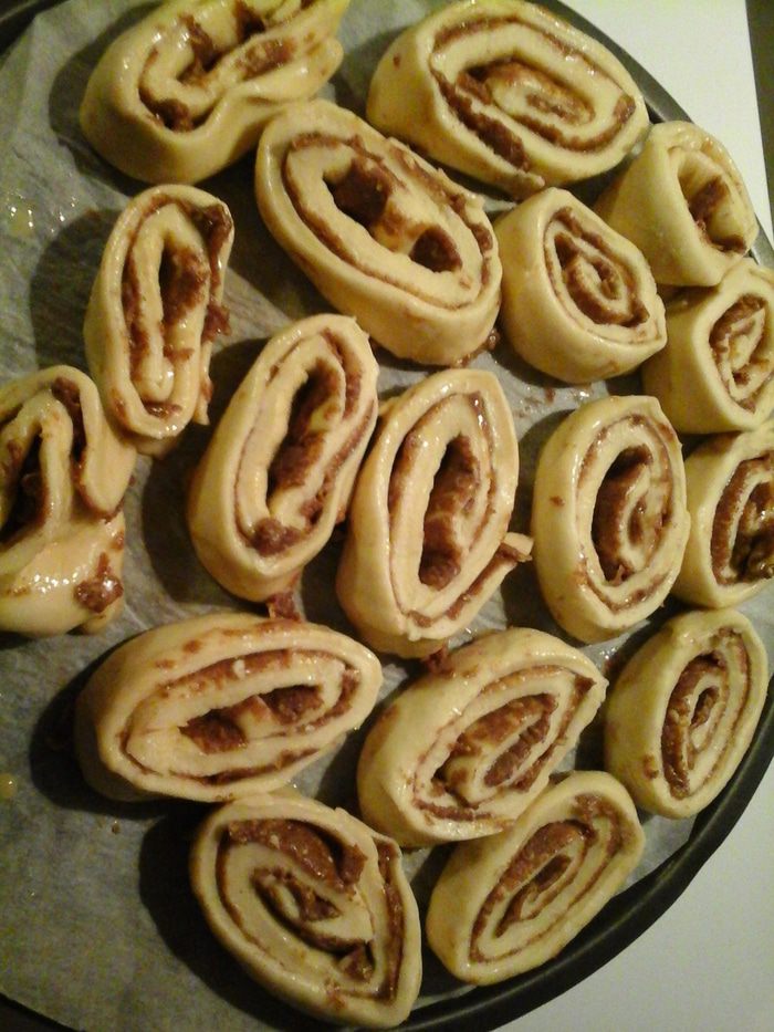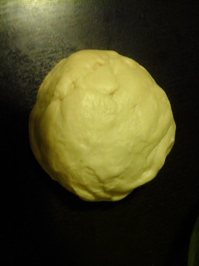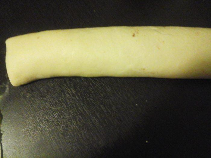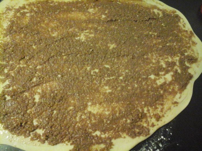 Берем тесто, раскатываем в прямоугольник и выкладываем равномерно начинку.