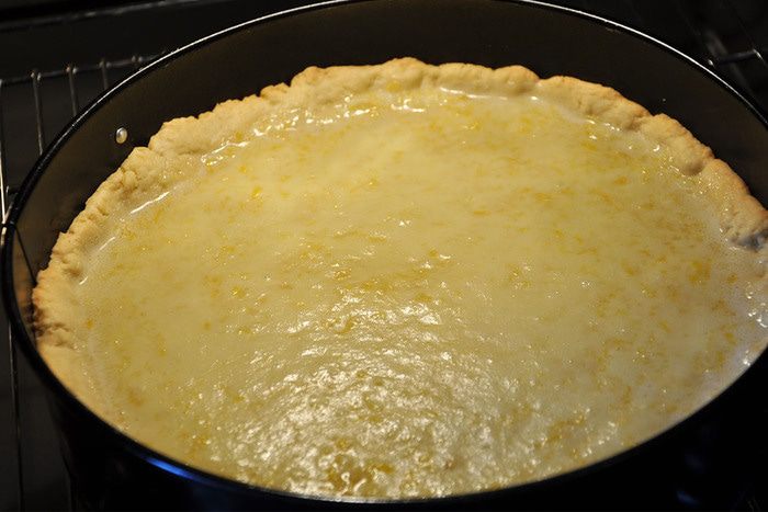 Взбить сахар с яйцами. Добавить соду, гашеную уксусом. В блендере смешать масло и маргарин (все комнатной температуры), добавить муку. Перемешать. Добавить яичную смесь. Выложить в форму, сделав бортики и наколов тесто вилкой. Поставить в хол-к на 30 минут. Затем запечь корж до полуготовности при 180 гр. Это около 20 минут.