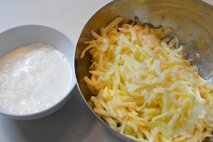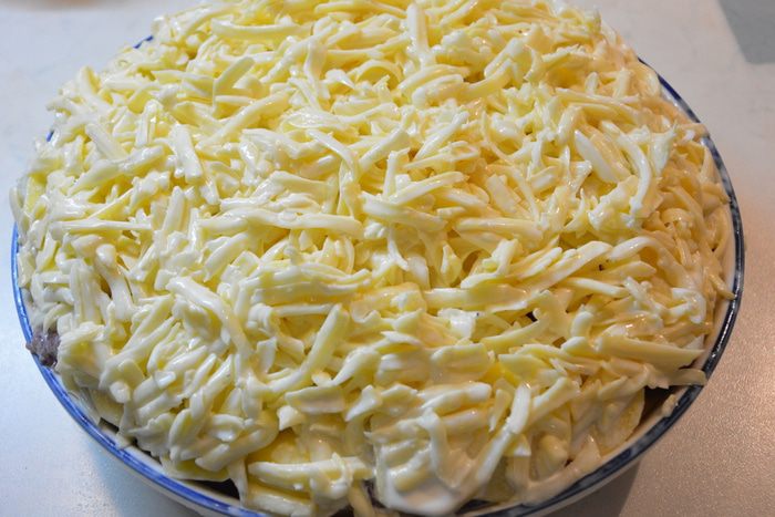Покрыть сверху сырным соусом. Для такого количества ингредиентов нужно брать блюдо побольше (у меня 28 см), потому что сыр немного потек при запекании.