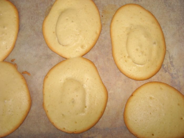 Сверху налить чайной ложкой тесто. У меня получилось 10 крупных печенек. Примерно 8 на 6 см.