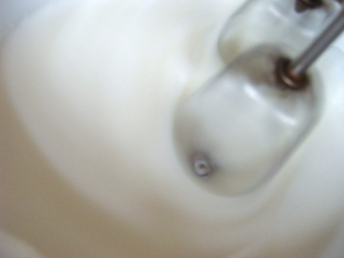 Белки взбить в густую пену до устойчивых пиков, с щепоткой соли. Потом добавить оставшийся сахар, продолжая взбивать.