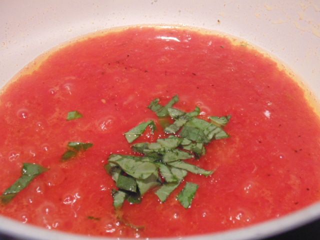 Соус: в сотейнике разогреть 2 ст. ложки оливкого масла, добавить зубчик чеснока, обжарить, затем чеснок убрать , добавить томатный соус и измельченный базилик, потушить 5 минут до загустения соуса.