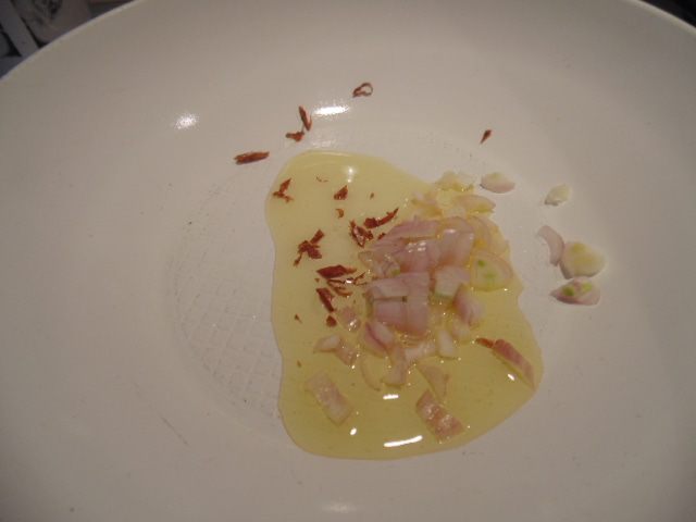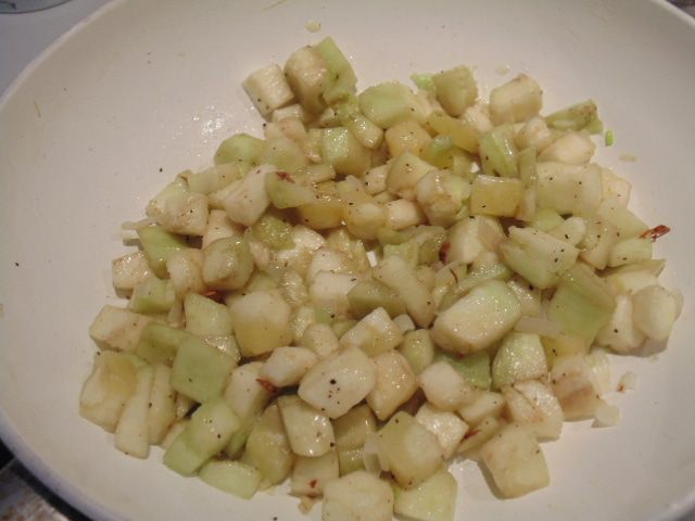 Начинка: лук-шалот и острый перчик чили мелко порезать, баклажан порезать кубиками. На 2 ст. оливкового масла обжарить лук с перчиком.