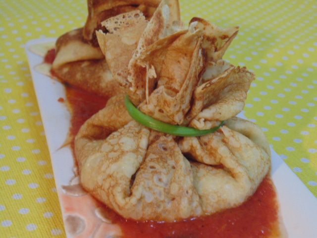 На середину блинчика положить баклажановую начинку, собрать края, скрепить зеленым луком (у меня не нашлось и я мучалась с петрушкой), поставить в разогретую духовку на 5 минут, подавать с соусом.
