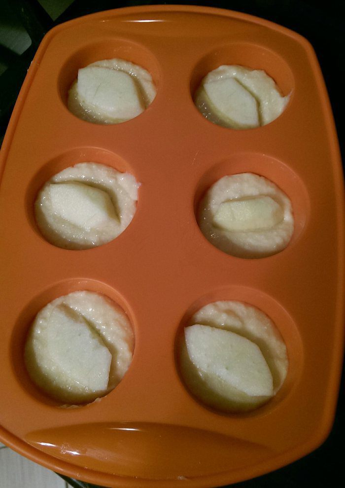 Далее в каждую формочку положить по куску яблока. Я резала дольки поперек, предварительно очистив от шкуры и семечек, но все зависит от размера формочек.