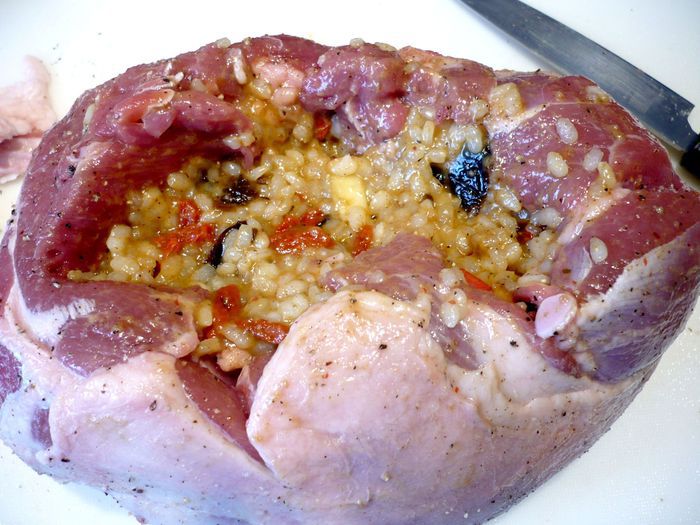 Мясо (без косточки) промоем в холодной воде, оботрем полотенцем. Наполним карман от ножки, слегка расширив его ножом, начинкой (у нас уйдет чуть больше половины начинки). Плотно свяжем кулинарной нитью, можно с двух сторон зашить отверстие.