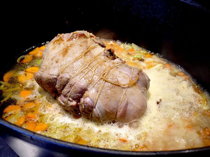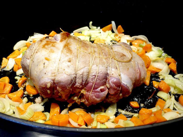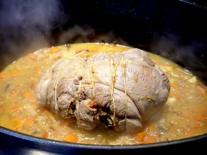 Снова перемешаем, закроем жаровню крышкой и поставим мясо в духовку. Готовим 1 час, при этом полчаса без конвекции (на нижней полке), а последние 30 минут — с конвекцией. Не забываем каждые 15 минут открывать крышку и переворачивать мясо. За 15 минут до конца запекания добавляем еще 150 мл кипятка.