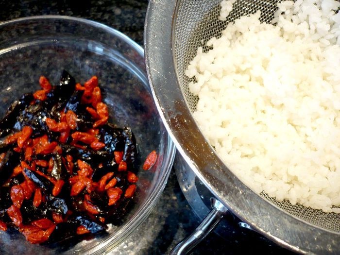 Теперь к начинке. Отварим рис до готовности, промоем его хорошо и дадим жидкости стечь. Барбарис (40 г (!)) промоем в воде, ошпарим кипятком. Чернослив (у меня без косточек уже) нарежем на полоски. Выдавим сок из половинки лимона. Перемешаем барбарис с черносливом, соком, добавим ванильный экстракт.