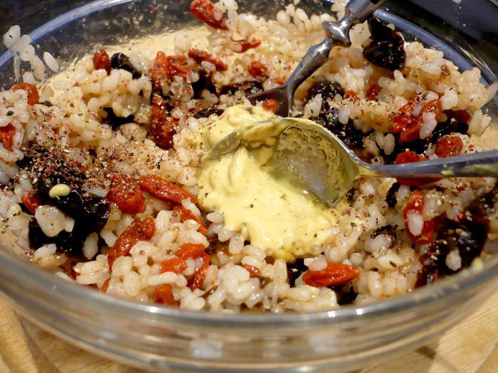 Смешаем рис с ягодами, добавим корицу, 2 ч.л. меда, горчицу, 1 ст.л. оливкового масла, соль и перец, перемешаем хорошо.