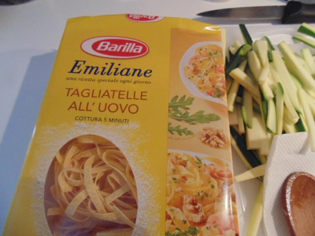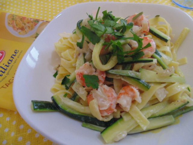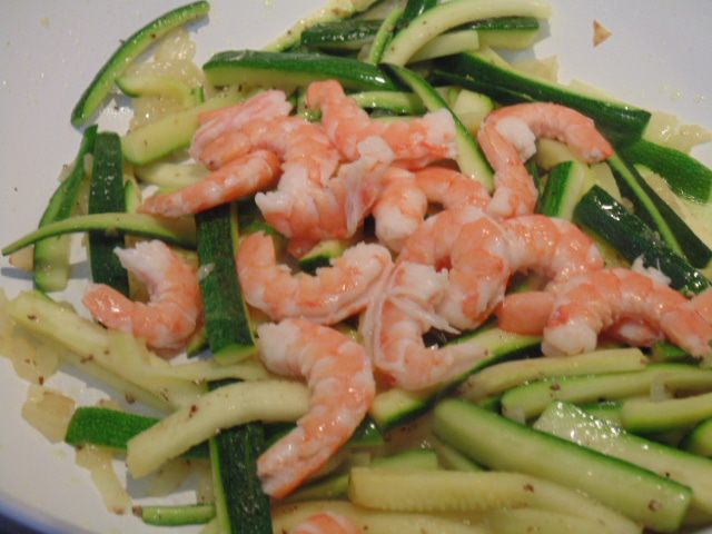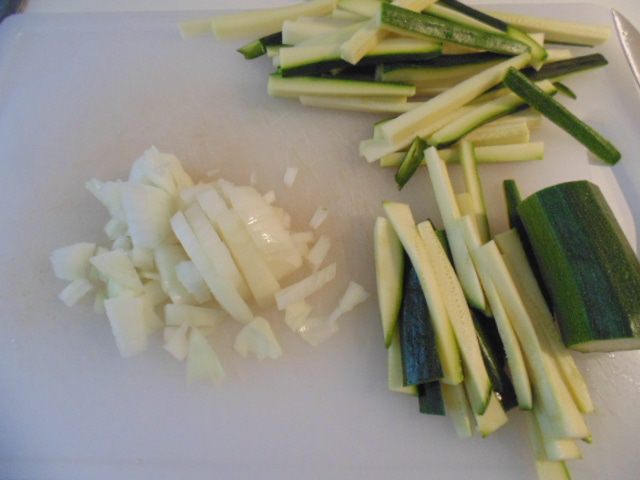 Креветки почистить, удалить кишечную вену. Небольшую луковицу мелко порезать. Цукини нарезать соломкой (вес двух цукини составил 230 грамм).
